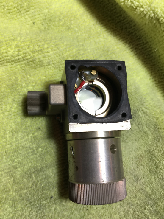 If no bubble is visible in the eyepiece, there is another simple method of checking if there is a bubble. There is a lens housing attached to the top of the bubble chamber which is used to provide a means for the navigator to a view a rotatable azimuth ring attached to the sextant mount (this provides the navigator with the means of swinging the sextant to the precomputed bearing of the object to be sighted). A more reliable method to determine if there is fluid in the chamber is to simply unscrew this lens and then set the lever on the side of the lens housing to “Diffuser Out” which then exposes the top of the bubble chamber. If you move the instrument around, you can then look for fluid in the chamber. Shining a light into the eyepiece, while you look down into the lens housing, may help.