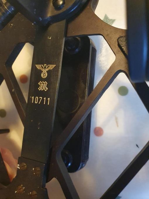During the restoration, it became clear that there was something unusual about C Plath 26276. Even disregarding the extensive provenance, it was clearly a genuine wartime Kriegsmarine C Plath sextant, but the C Plath trademark (a stickman holding a sextant) was missing from both the arc and the handle. Figure 6 was taken to show these two logos in an otherwise identical sextant from ca. 1942. Fakes, of course, normally add the trademark to a non-original item, so this was more a cause for interest than concern. On removing the mirrors, the C Plath part markings were present (Figure 5), confirming that the parts had been made in a C Plath factory. But why were the trademarks missing? Given the late serial number, it is surmised that this instrument was made up from parts in a machine shop in Germany after the C. Plath factories in Ostrołęka and Sopot in Poland had been overrun by the Red Army in late 1944 or early 1945. It would then have been delivered to the Kriegsmarine and subjected to an examination. It seems by this stage of the war the Kriegsmarine merely stamped the certificates Entspricht den Bestimmungen der Kriegsmarine (“corresponds to the regulations of the Navy”) and Das Instrument is den fur Gebrauch aus fehlerfral zu bezeichnen (“the instrument is intended to be used without error”). The sextant would then have been issued to a ship or submarine. In this case, it went to U-3008.