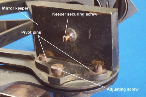 The next photo (Figure 15) shows the arrangement in place. The screw passes through the frame into a tapped hole in the base of the mirror mounting and is used to tilt the horizon mirror in such a way as to remove side error, as index error has been taken care of by the index turntable, but note also that there is a capstan headed screw which can also deal with index error. Perhaps it was a later addition, the index turntable having been found wanting.