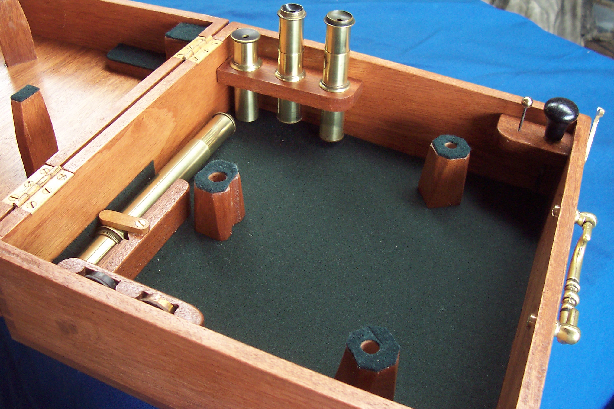 The name of Dollond arises again in relation to achromatic objectives. John Dollond is often cited as the inventor of this type of lens, even though it is well established that Chester Moor Hall was making them for himself in 1729 and it was well known to the optical trade by the middle of the century. Nevertheless, John’s son Peter urged him to take out a patent and in this he was successful, against staunch opposition from about thirty of the leading London opticians. There is a link to Jesse Ramsden, the inventor of the first precision circular dividing engine. Ramsden is thought to have tried to put the record straight and he was in a good position to know it, as his wife was Peter Dollond’s sister. There is a space for an inverting telescope, which would have been about 140 mm long and of probably about 6 power.