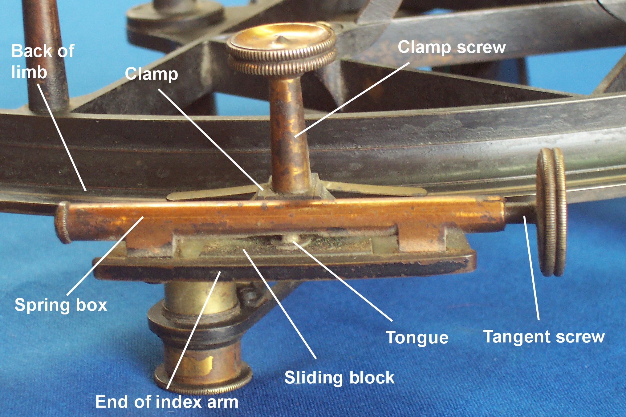 As close examination of Figure 1 will show, the silver arc does not extend right to the ends of the limb. This is a most unusual feature which suggests that the undercut slot for the arc was formed before the limb was attached to the frame. It could not otherwise have been cut, as dovetail milling cutters, still less milling machines, had not by then been invented and it would have been nearly impossible to form with chisel and files. Both earlier and later sextants, where the arc extends to the ends of the limb, would have cut the slot by turning the part on the lathe, but as the radius of the arc is 192 mm (7.56 in) the intermittent cut would have presented a challenge to the lathes of the day. Possibly, the ends of the slot were filled in with a sliver of brass after setting in the arc. (See Postscript no. 2)