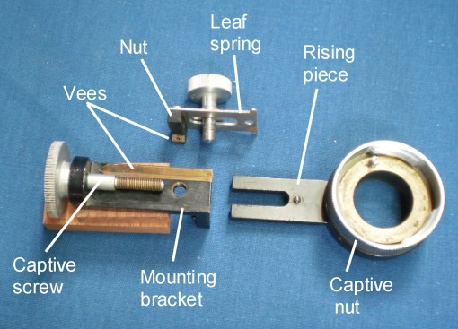 There is nothing unusual about the mounting of the shades, except that all the washers are free to rotate on the tapered shafts, while later designs adopt some means to stop them rotating, so that when one shade is rotated into place, the movement is not transmitted to the adjacent ones. The design of the rising piece is also unremarkable for the time and was followed with various more-or-less complicated minor modifications until the mid 1950s.