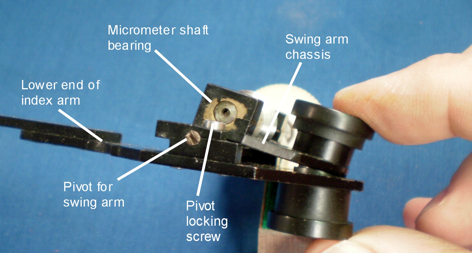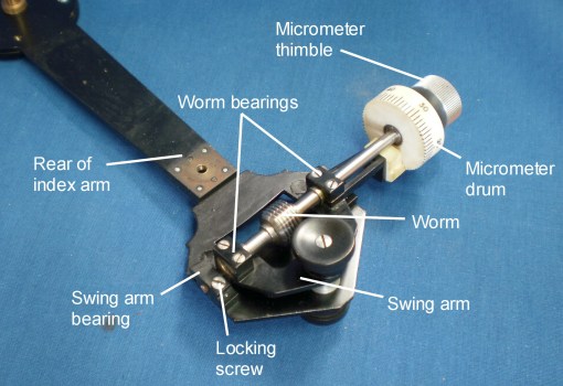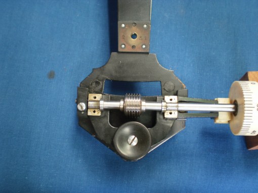The index arm and its bearing was next for attention. A tapered shaft attached to the upper expanded end of the index arm runs in a bearing that fits closely in a hole at the apex of the frame. Bearing play is taken up by moving the shaft axially into the bearing by means of an adjusting screw on the end of the shaft operating through a washer. The end of the shaft is squared to fit a square hole in the washer so that latter rotates with the shaft and cannot loosen the screw. This design did not change at all during the next two centuries.
