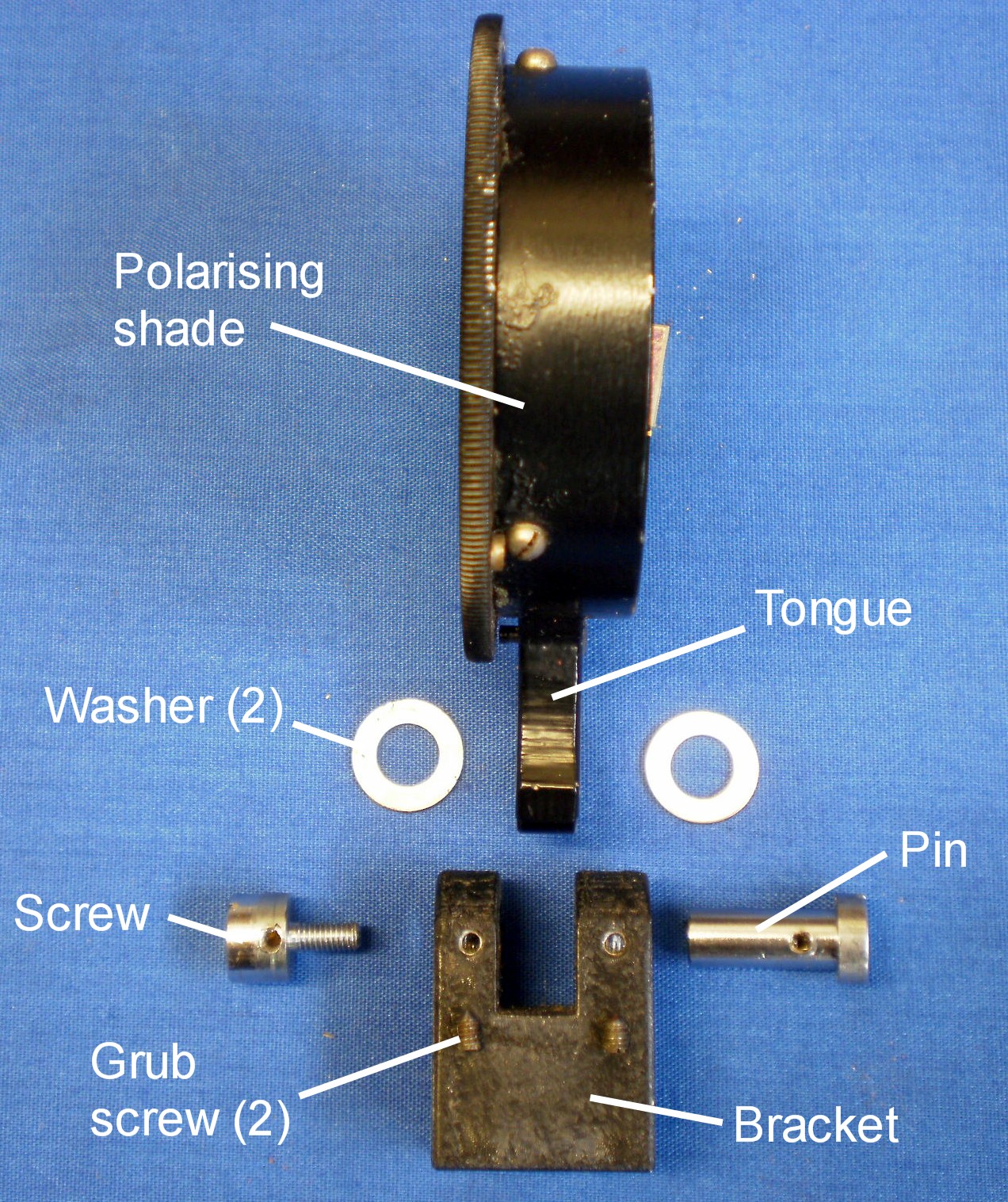 There is quite a variety of ways of attaching shades to their mounting brackets and the method may appear mysterious to someone seeking to overhaul or tighten a shade that has become annoyingly loose so that it does not stay where it is put. Figure 5 shows the horizon shade in its mounting and Figure 6 shows it exploded. At a casual glance, the two grub screws may be overlooked and the heads of the mounting pin or adjusting screw mutilated in futile attempts to turn them. Each grub screw must first be backed out, using a well-fitting 1.5 mm screwdriver to do so, as if the slot is destroyed, the overhauler will be faced with an even greater problem.