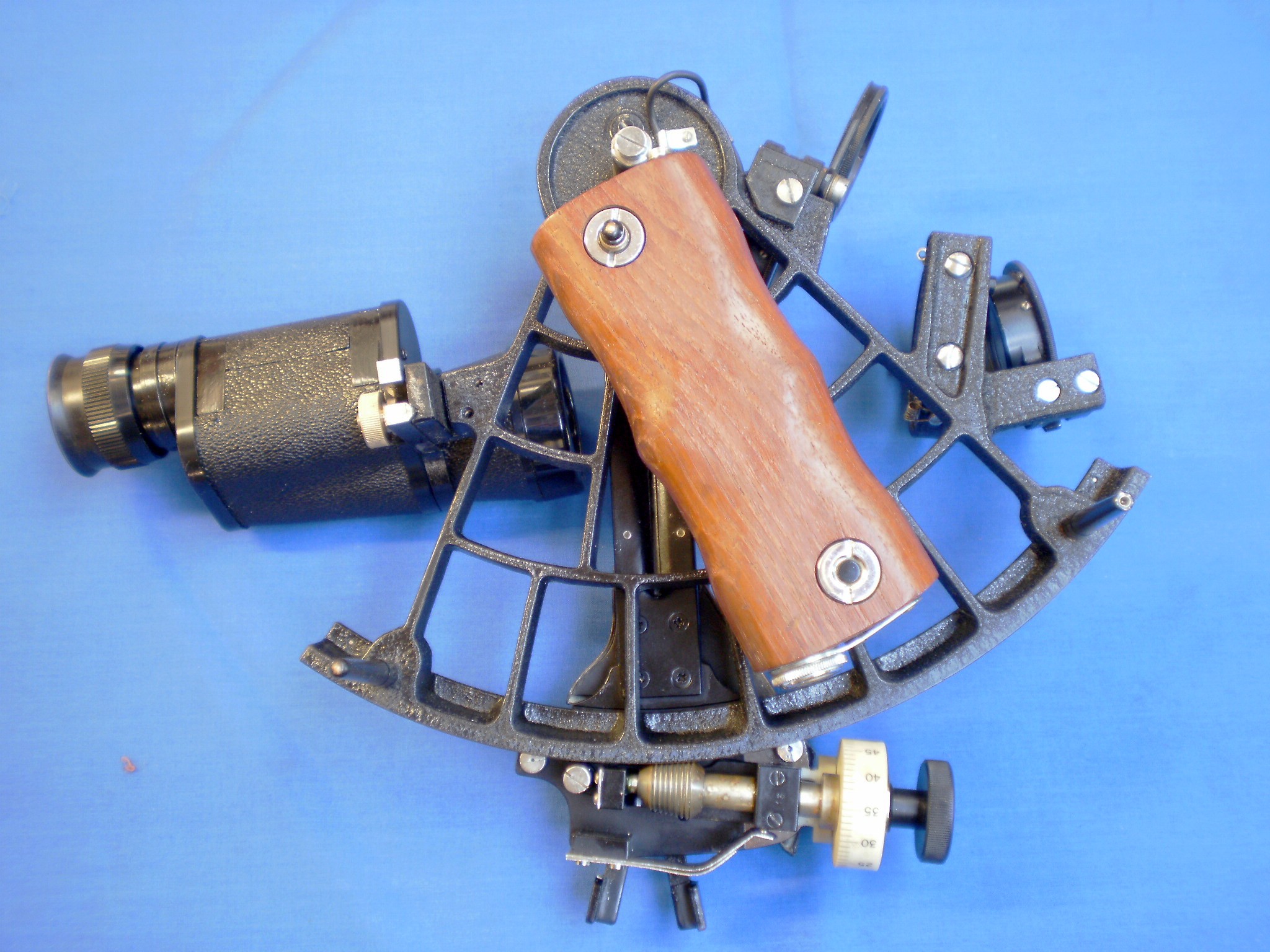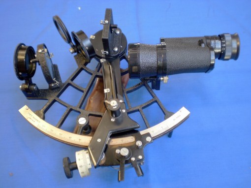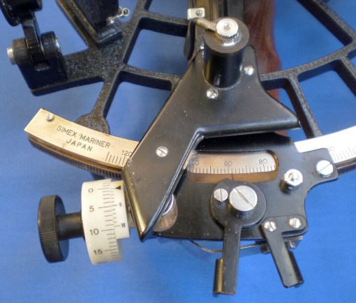 In about 1963, Captain Svend Simonsen, a merchant seaman officer who had retired from the sea, is said to have tired of selling shoes instead, so he set up a navigation school, at first teaching students in their own homes and then by correspondence. By 1971, it was a thriving business, trading in Santa Barbara, California, as the Coast Navigation School. Captain Simonsen arranged with Tamaya of Tokyo to provide him with sextants named “Simex”, for him to on-sell to his students and others. There were, it seems, several models for sale, with various telescope, shade, mirror and frame options, reflecting the options that Tamaya offered under its own name, hence the plural in the title of this post. Recently there came into my hands a sextant named “Simex Mariner”. It had plainly been dropped, as a leg and the telescope stud had been broken off, but it had been a high end sextant, as it has a bronze frame, polarising shades, scale illumination and a micrometer vernier reading to 0.1 minute. Figures 1 and 2 show it after overhauling and checking, and replacing broken parts.