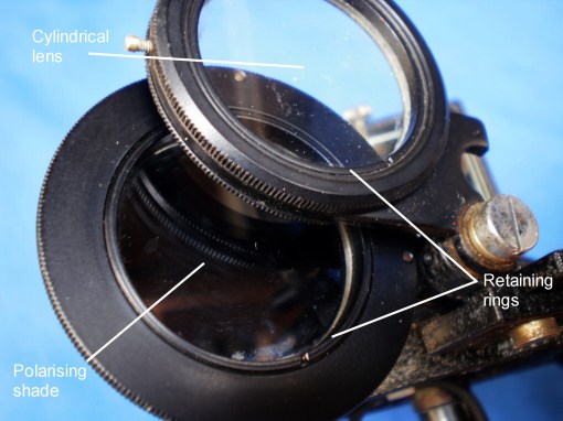 The shades use crossed polarising filters to give continuously variable darkening of the view. The idea was first mooted in a patent of about 1938 and some versions of the US Navy Mark II sextant were fitted with polarising shades, but the material seemed to fade after a few years. In my Simex, the index shade worked perfectly well, but one of the filtersof the horizon shade had lost all its polarising properties. Access is easy, by unscrewing the retaining ring shown below in Figure 4. The material is sandwiched between two sheets of plain glass, and by soaking the filter in acetone overnight it is usually possible to slide the two apart and clean off the remnants of the polaroid material. As mine had faded uniformly, I simply stuck a layer of self-adhesive polaroid film to the outside of the glass, a solution that has worked well.